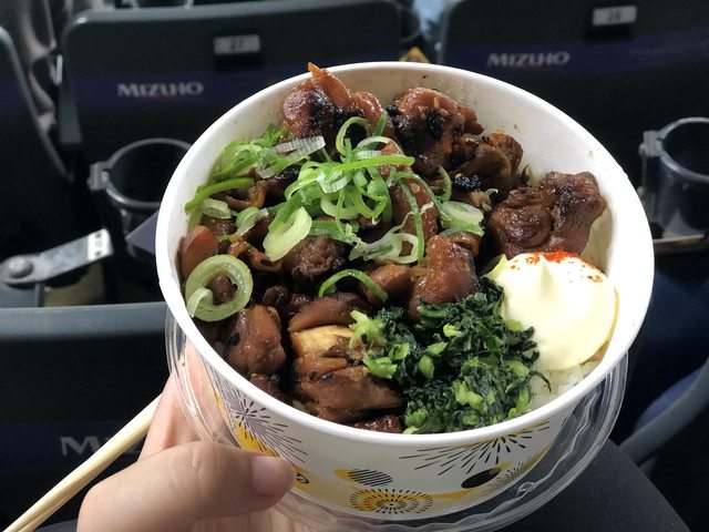 下午一點的比賽選擇在球場用餐,柳田這款便當肉量頗多、調味偏鹹但配飯剛好