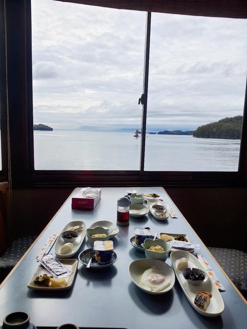 僻漁村的河豚料亭旅館房間可以直接看到日出,一整晚聽著海浪的聲音入睡覺得很幸福。