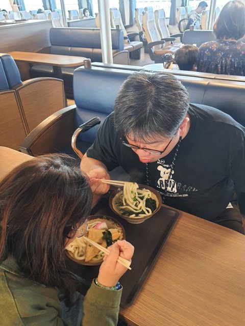 下次再見。搭上渡輪無聊就吃烏龍麵吧!出乎意料的好吃(可能我們也很好養),一人一碗