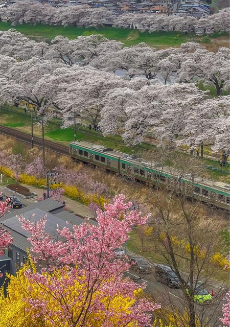 點是船岡城址公園,可以架設望遠鏡頭從高處俯拍東北本線電車行經整片盛開櫻花的絕美