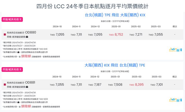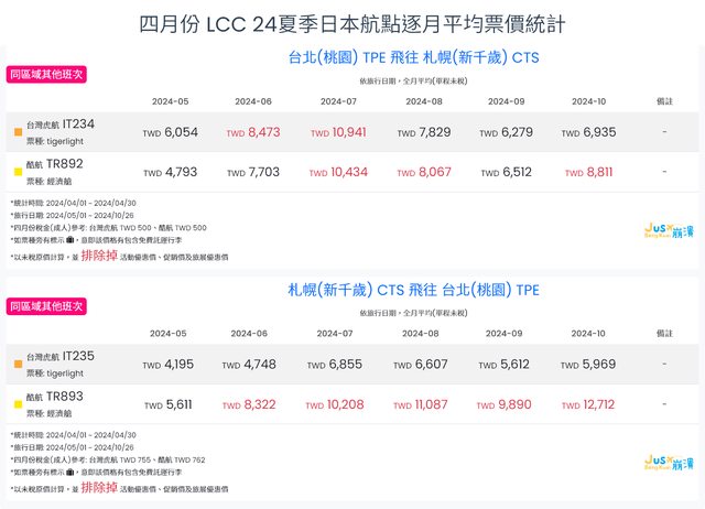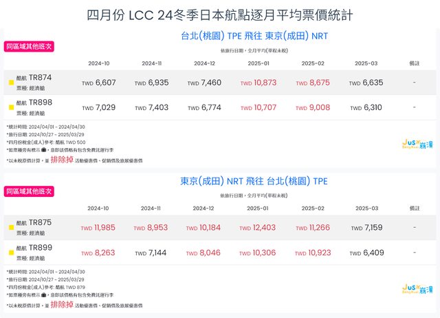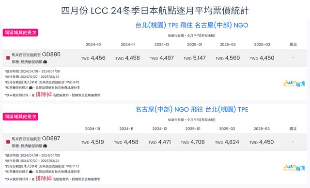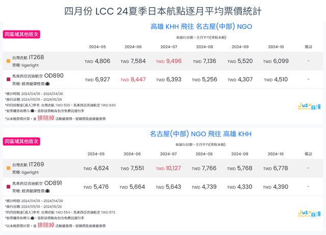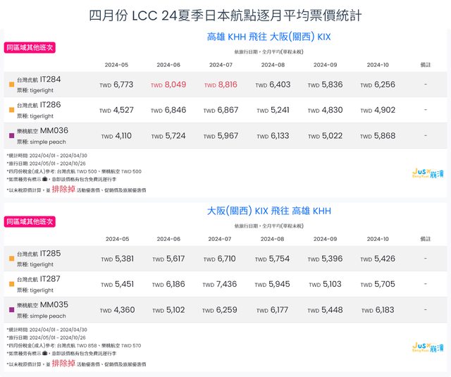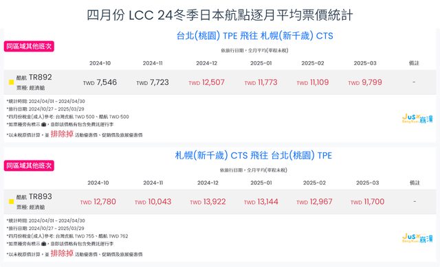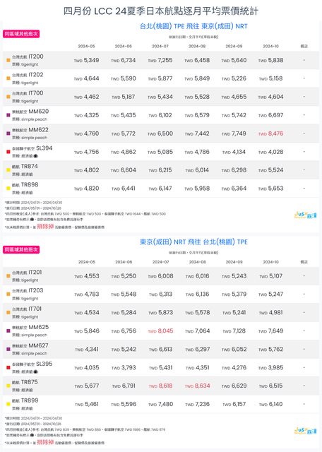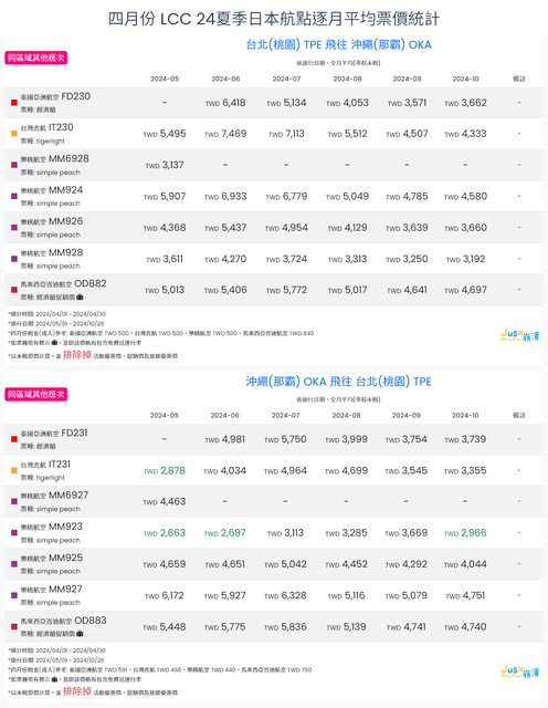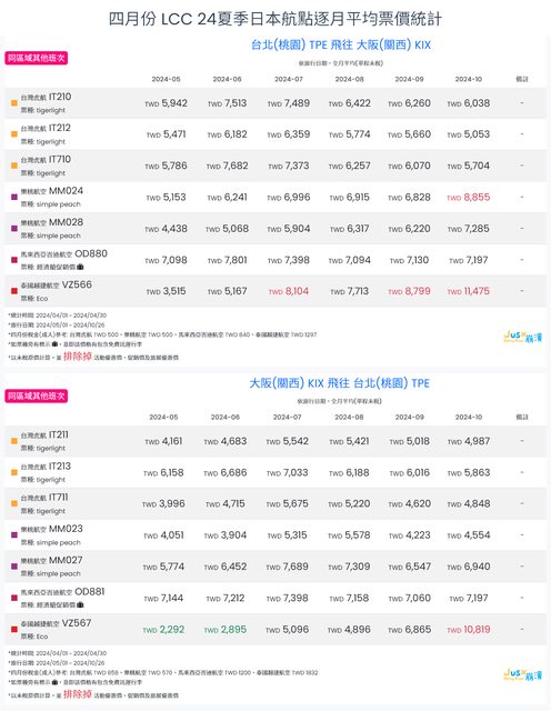 標題[分享] 4月LCC 24夏、24冬日本航點逐月均價統計