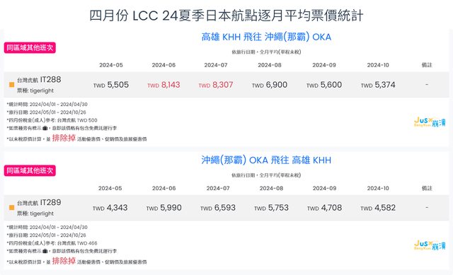 沖繩:出發月6-7月以往就是旅遊熱門月份,所以目前價格表現也是反映在旺季程度