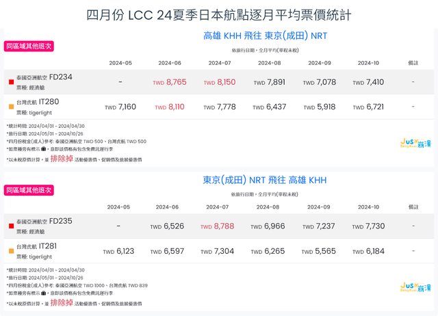 高雄=東京成田:整體來講真的就是「漲」,但在間區內可能會有一些價格波動,若有考