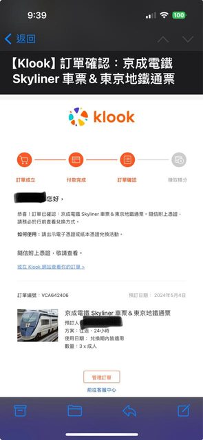 skyliner電子郵件寄送klook的訂單,請自行至京成電鐵機器用QRcode兌換(兌換期限至2