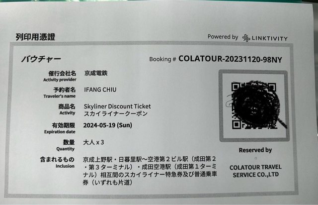 1. 讓售品項:京成電鐵單程車票兌換券skyliner