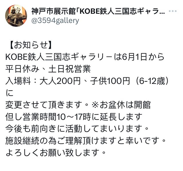 標題[資訊] 神戶「鉄人三國志」展覽館調整營業時間