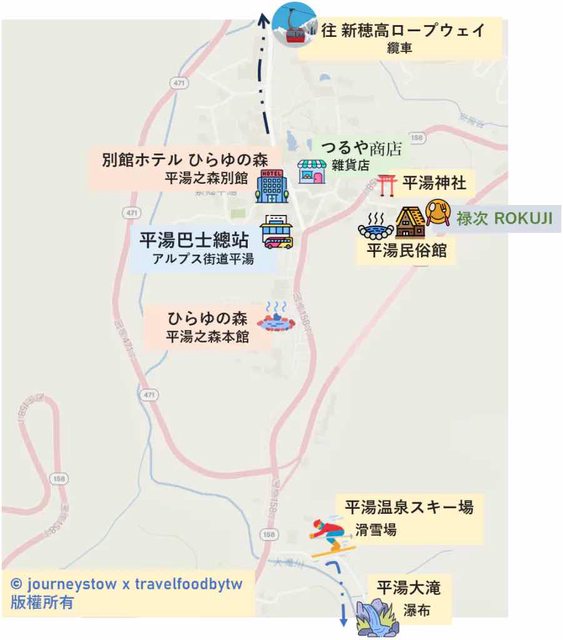 以下是平湯的主要景點,大概半天到一天就可以逛完了