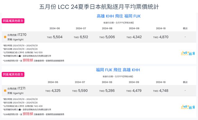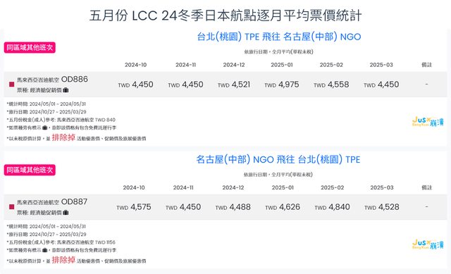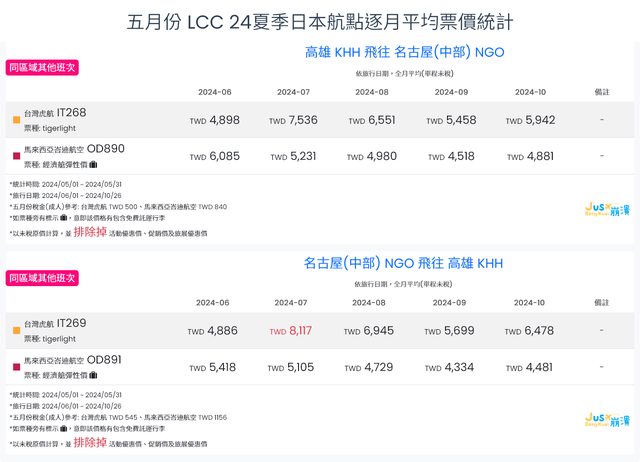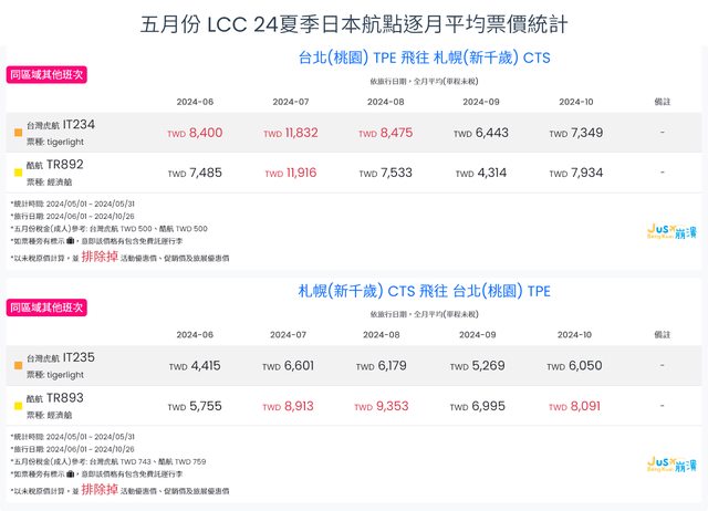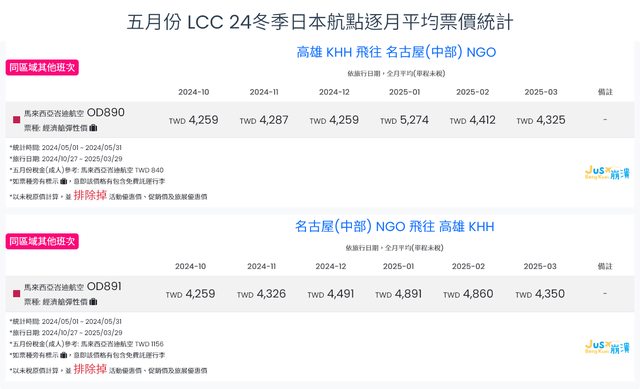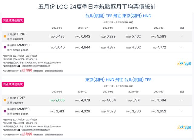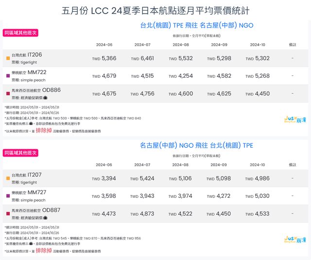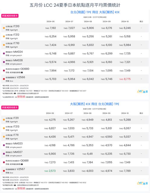 標題[分享] 5月LCC 24夏、24冬日本航點逐月均價統計