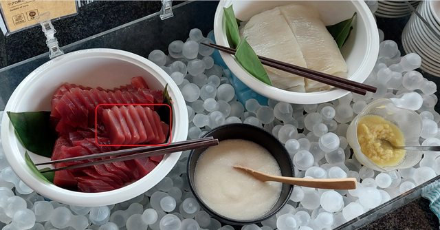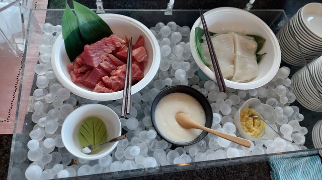 早上飯店早餐是第一個進去的,它生魚片區的樣子 06:27
