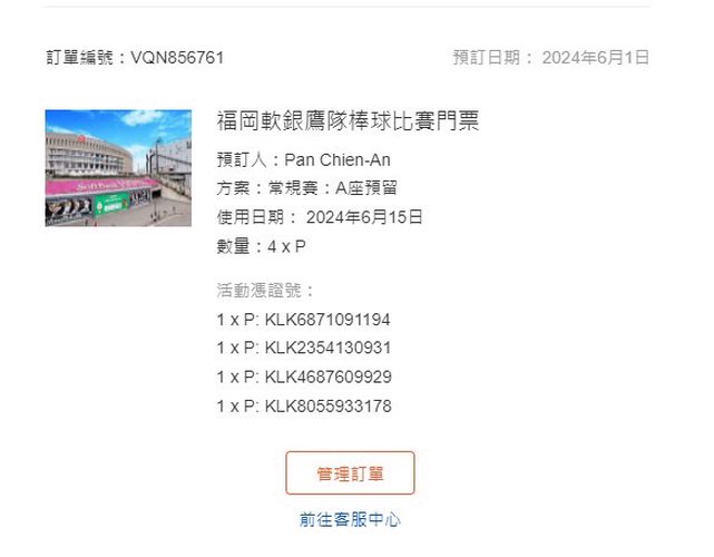 標題[讓售] 6/16福岡巨蛋軟銀球賽*4