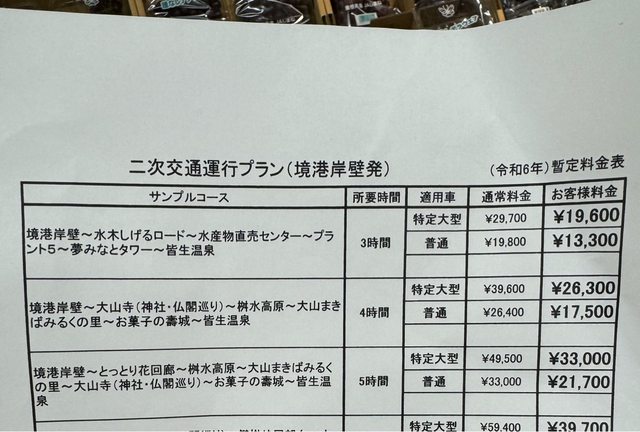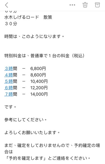 我在前往日本鳥取前就先透過email先和米子交通公司約定好行程及費用, 一共是5小時的方案,如圖所示: https://i.imgur.com/uCNniIC.jpeg