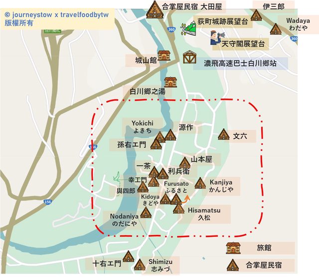 推薦大家選擇住在紅框框內的民宿,該範圍算是合掌村的主要觀光地區,我們這次是住在巴士站北邊的大田屋,整個住宿體驗很好,不過他是少數幾家不在景點集中區的民宿,小缺點就是需要走一小段路(10分鐘+)才會到景點區~