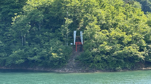 供奉奧只見湖守護神的十二山神社, 這邊只有搭船才能進去。