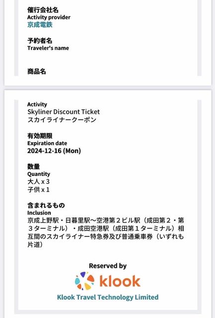 標題[讓售] skyliner 單程票 3成人1兒童