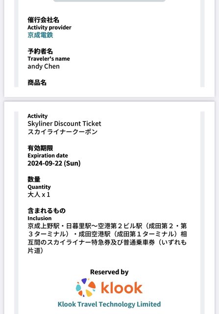 2.Skyliner 成人單程票,可以任選去程或回程