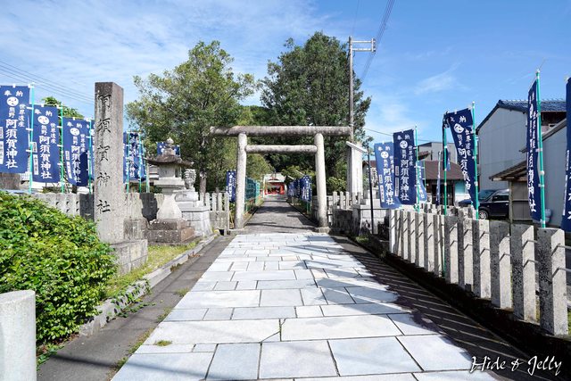 阿須賀神社筆直的參道,參道上有兩座石鳥居與大型的石碑,前方的鳥居為「神明鳥居」