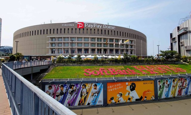 線的唐人町站下車,走約750公尺就到球場,途中是一條沿著河邊有一堆軟銀球員海報的