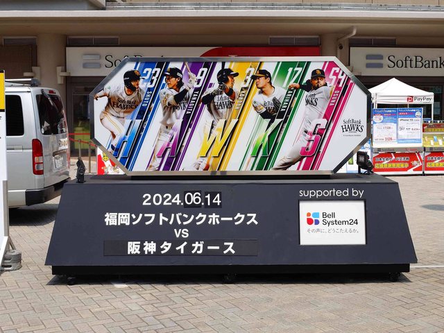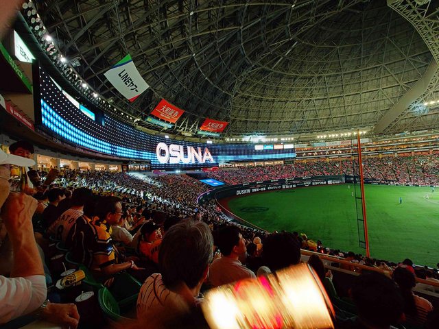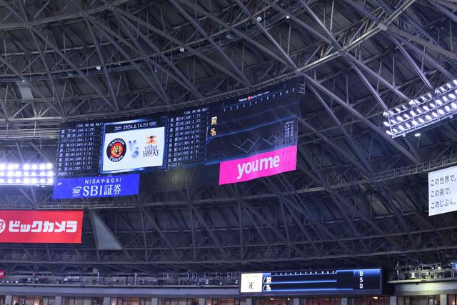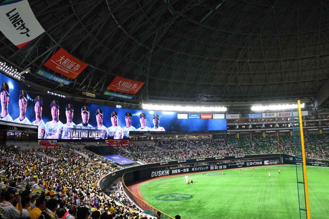 Paypay幾乎涵蓋整個外野的曲面大螢幕是好幾片LED拼起來的,本壘後方還有一大片曲面