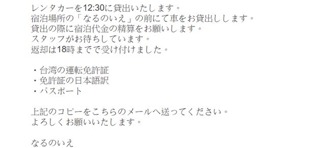 回信時說我到島的時間,大致估了個18:00還車,跟對方說明我是外國人的狀況