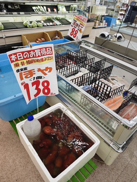 活水箱裡面就是ほや(海鞘)跟活扇貝………咦? 一顆扇貝88日幣?