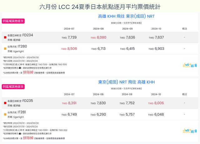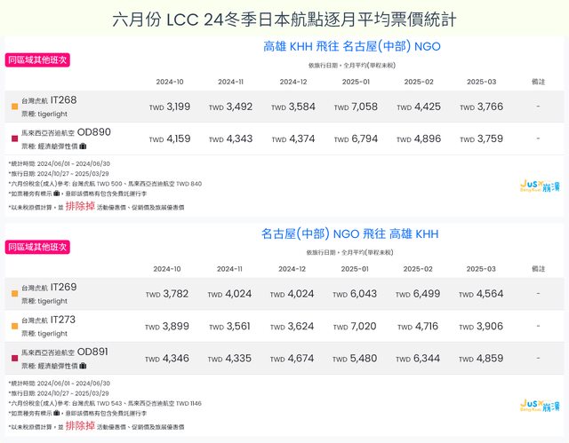 標題[分享] 6月LCC 24夏、24冬日本航點逐月均價統計