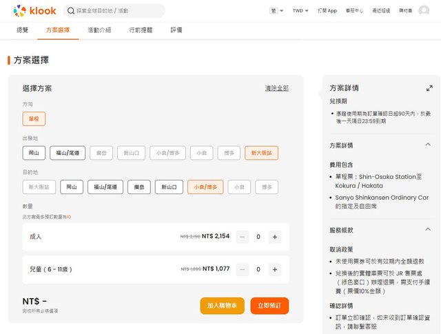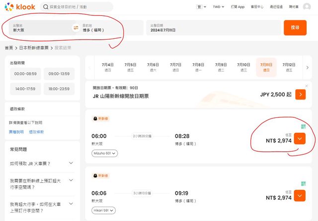 klook如果直接搜尋"新大阪-博多"新幹線單程票