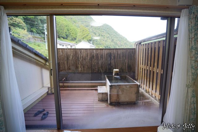從陽台的風呂處探頭可以到前方的馬路與山坡上的小徑,不過如果不探頭,泡在浴桶內的