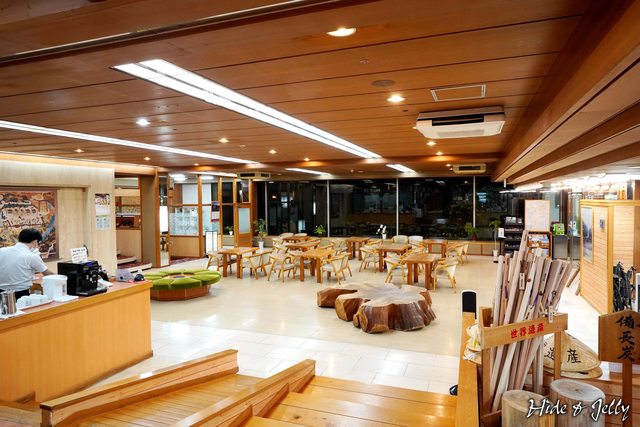 大廳內相當寬廣明亮,採用熊野原始的原木色調,熊野杉的茶几也裝飾其中,一旁還有販