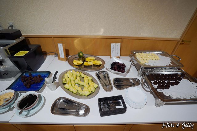甜點水果部分,提供三種水果,兩種蛋糕,外加巧克力口味的蕨餅。水果中的葡萄與哈密