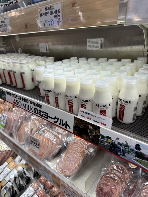 隔天一早就是去阿蘇車站旁邊的販賣部買阿蘇牛奶、布丁等名產吃,早上人潮滿多的,牛