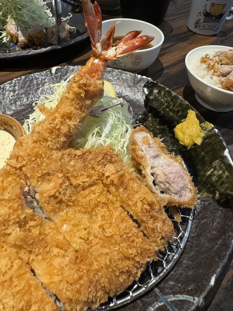 白黑豬最貴的兩種里肌跟腰內都點下去再加炸蝦。我覺得里肌比腰內好吃,但平心而論兩