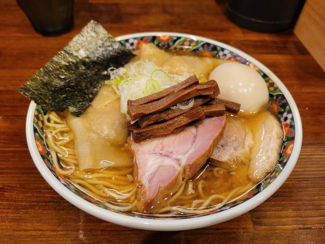 湯底是多種煮干加入豬雞混合的動物系高湯,配上濃口但略帶甜味的醬油基底。初喝時並