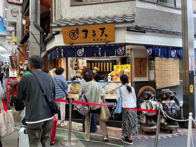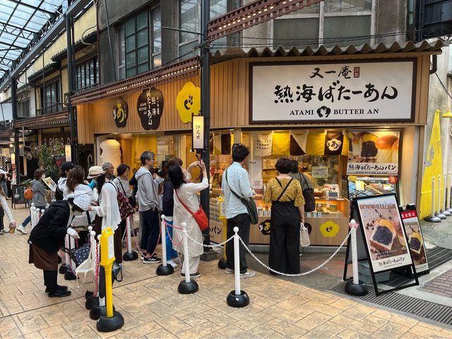造訪日期:2024年6月 06/21(五) 近11點Check out後,搭巴士(260円)到修善寺駅,再搭車到熱海(880円)。逛一下熱 海站前平和通及仲見世通的商店街,排隊買たこ棒及Butter An紅豆包,都不錯吃。