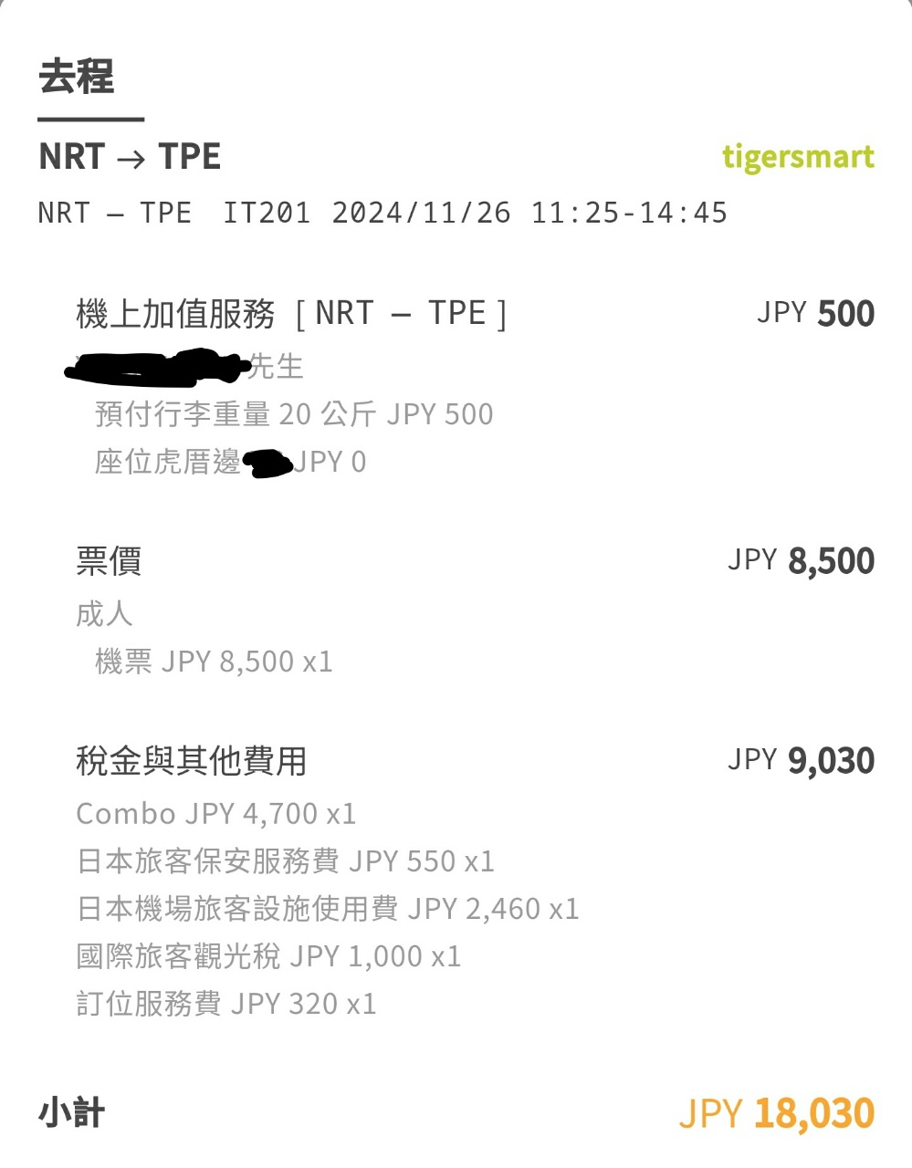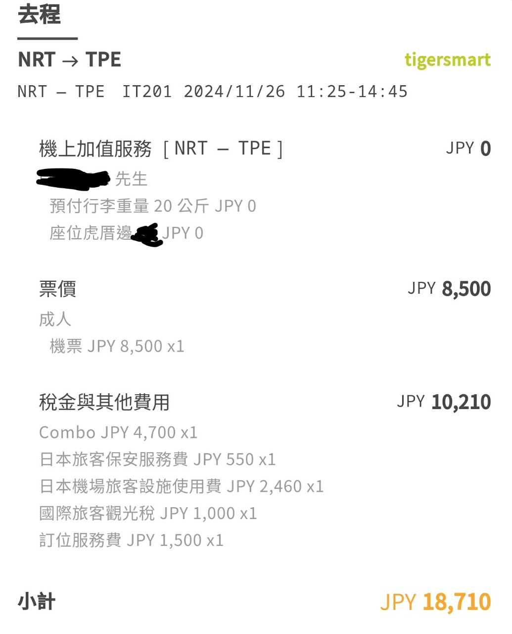 推 burnsy0018 : 為何兩次票價一樣總價不同?我買tigersmart應該有免 07/16 10:47