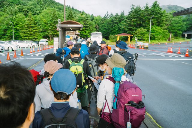 結果05:45抵達二合目水ヶ塚公園時發現大事不妙,排接駁巴士的人龍超級長,趕緊換裝