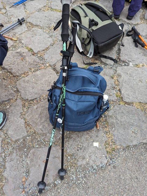 雨具、頭燈、水、登山杖、保暖衣物、錢