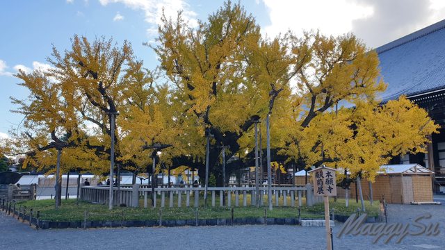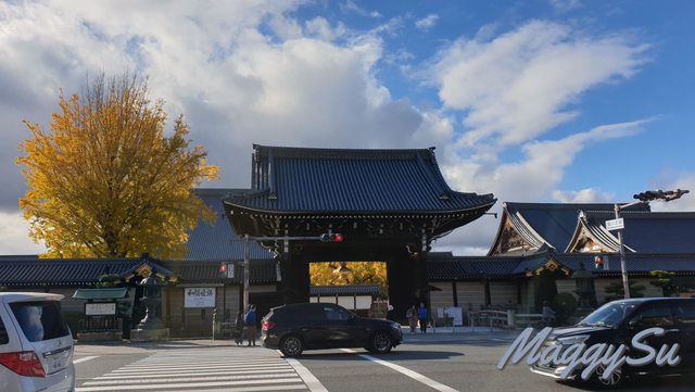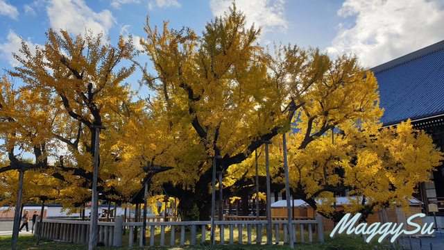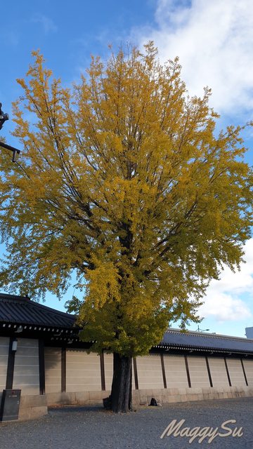 離開光明寺後,我們搭車到京都車站再轉公車到西本願寺看銀杏,進西本願寺前先在對面住宅區裡一家當地的小餐館吃飯,因為過了用餐高峰期,店裡只有老闆夫婦及一位熟客在用餐,所以我們一家人能安靜地吃飯休息也挺好的。用餐完準備回到西本願寺的途中無意發現這個小角落,覺得排列在街道旁的銀杏也很美,真是意外的驚喜。西本願寺的大銀杏還是跟多年前我跟爸爸來看的時候一樣地壯觀,媽媽也稱讚說不管是以楓葉還是銀杏當背景拍出來的照片都很好看。