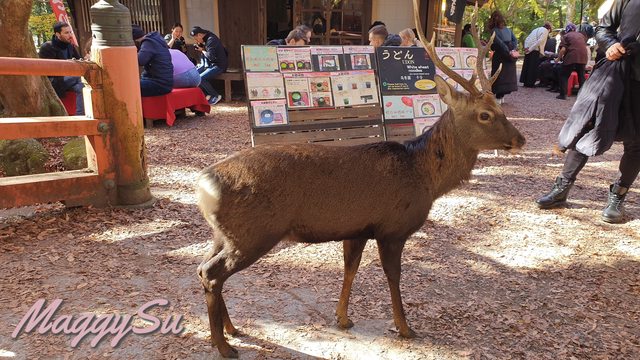 第一次來奈良的媽媽看到這麼多鹿覺得很新奇,在若草山麓或春日大社附近的鹿對鹿餅比