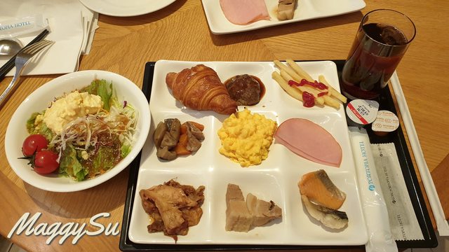 我們住宿三天有兩天是有含早餐的,櫃檯人員告訴我早餐有2家餐廳,分別是位於2樓的咖啡餐館SOCO跟位於30樓的景觀餐廳GOCOCU能自由選擇,我兩邊都想嘗試看看,於是便各去一天。首先去的是2樓的咖啡餐館SOCO,早餐都是buffet型式,和式西式的餐點都有,品項也不少。但這裡似乎是團客主要用餐的地方,所以稍嫌吵雜及人多擁擠,相較起來我們比較喜歡隔天去的30樓景觀餐廳GOCOCU。