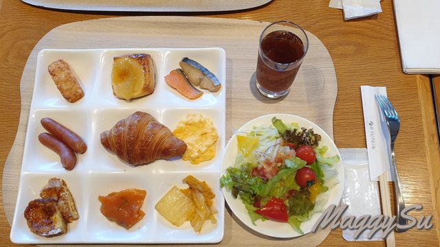 這天早上我們到30樓的景觀餐廳GOCOCU用餐,服務人員都會優先安排靠窗的區域,感覺很貼心。這邊同樣是buffet型式,品項也很多,餐點都蠻好吃的,尤其是九宮格最上面中間的那個蘋果派,我吃完還再續了一個,明明平常我是不太愛吃派類的。難道是心情愉悅加持的關係嗎?XD 爸媽對這頓早餐也是相當滿意,媽媽還嘗試了餐廳現打的青汁,她看到很多人都在喝也去拿了一杯,結果意外的大受好評。能幫助消化又合胃口真是太好了。