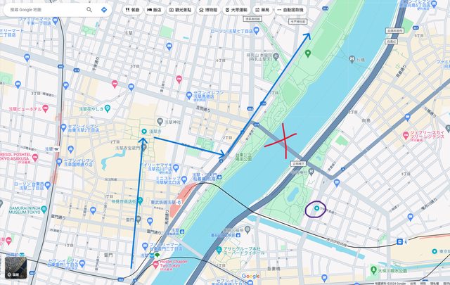 但走到言問橋的岔路口時才發現言問橋已經開始交通管制,不能過橋,應該是我們太晚來