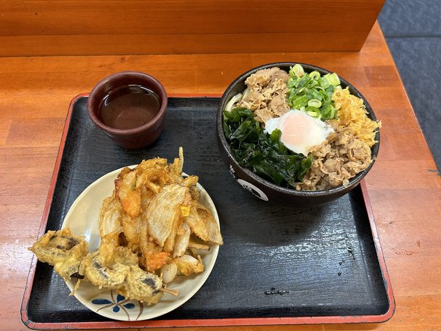 至櫃台點選和領取烏龍麵,再夾取炸物的店,價格非常便宜我點了烏龍麵加炸物如下圖,