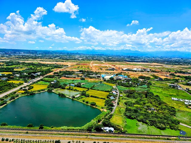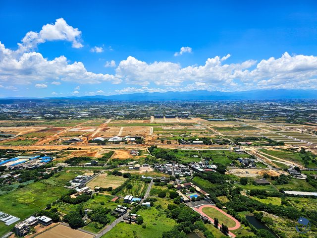 近處左側大樓區域是桃園青埔,中間可以看到樂天桃園棒球場,遠處就是中壢市區。