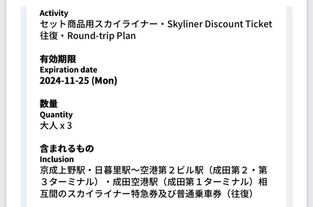1.讓售品項:3張skyliner 上野到成田機場來回兌換卷 期限到2024/11/25