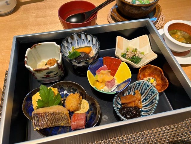 ボン・ボニエール(前菜)、お椀(湯)、彩、お造り(生魚片)、焼き物(烤物)、お食事(飯