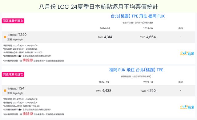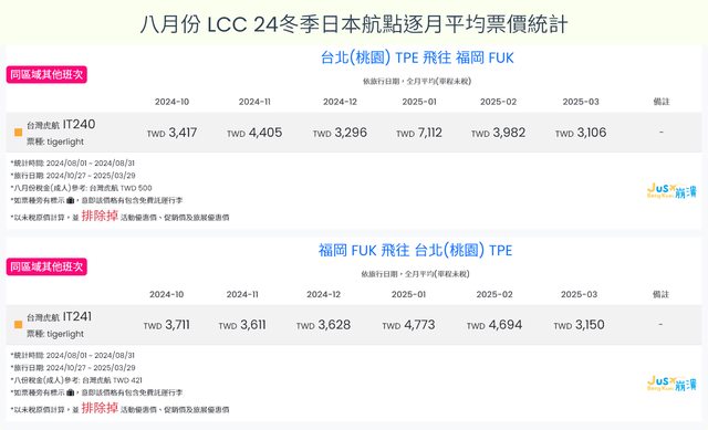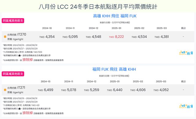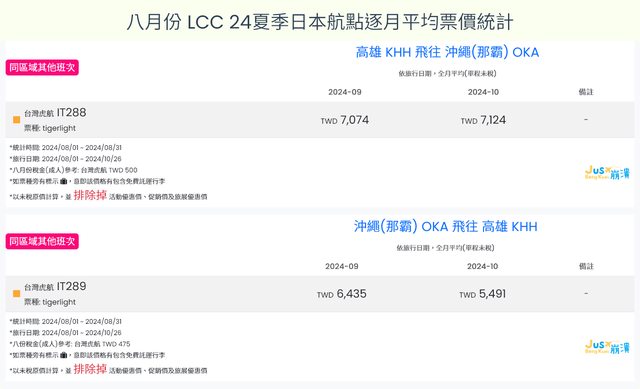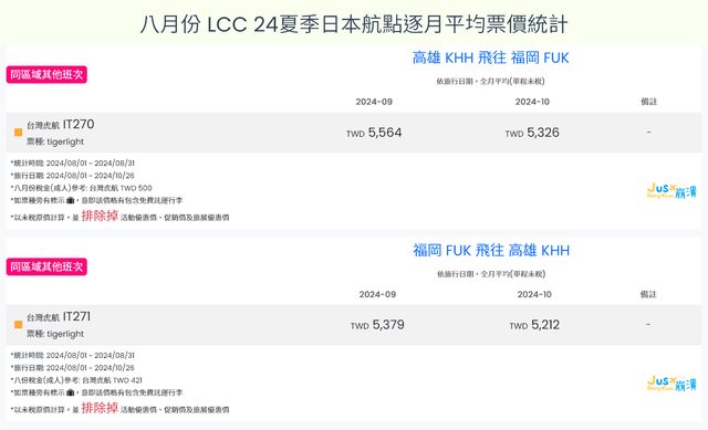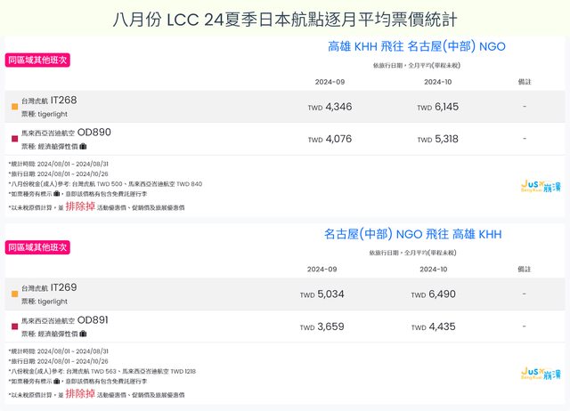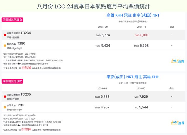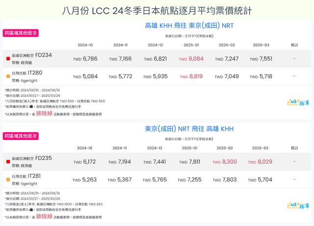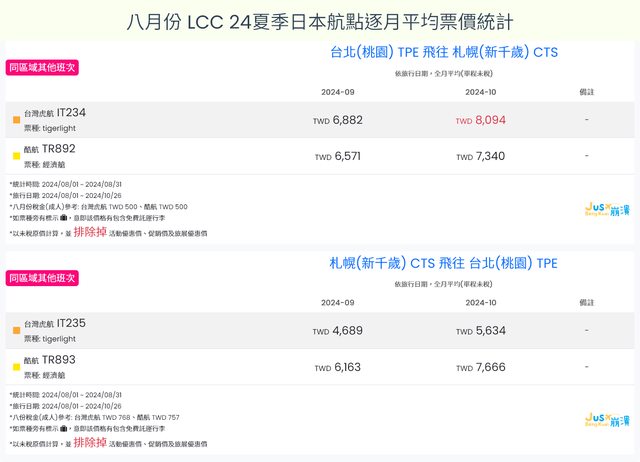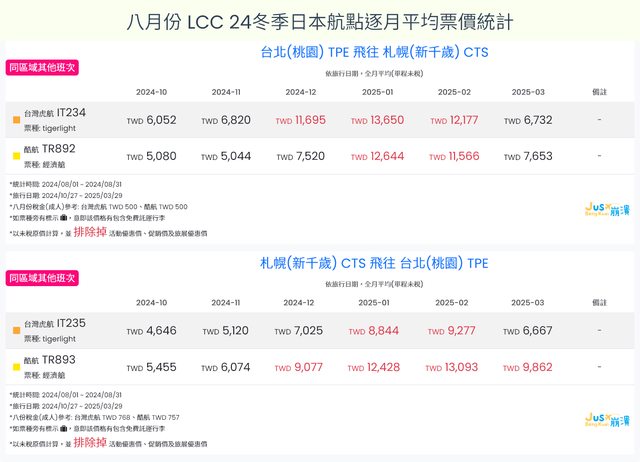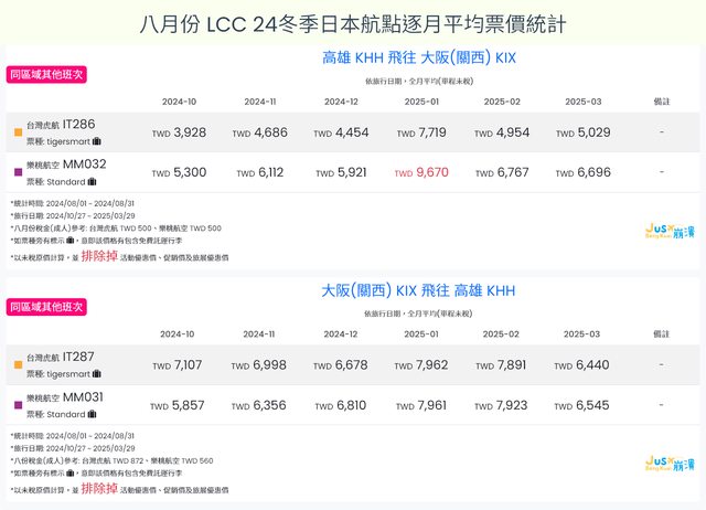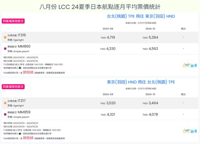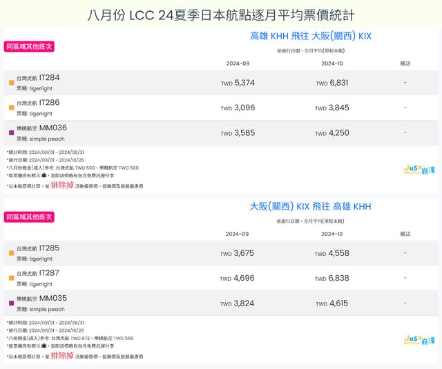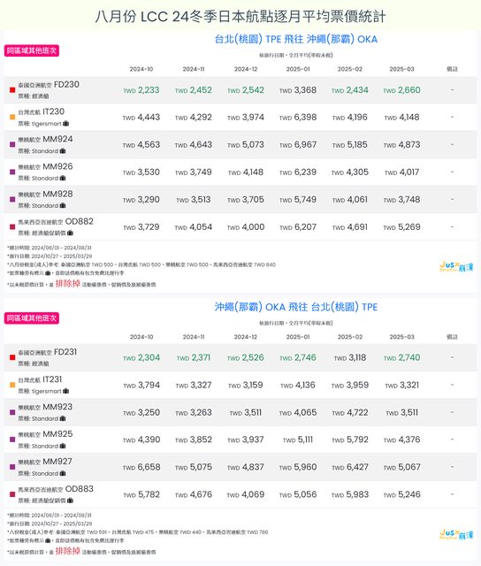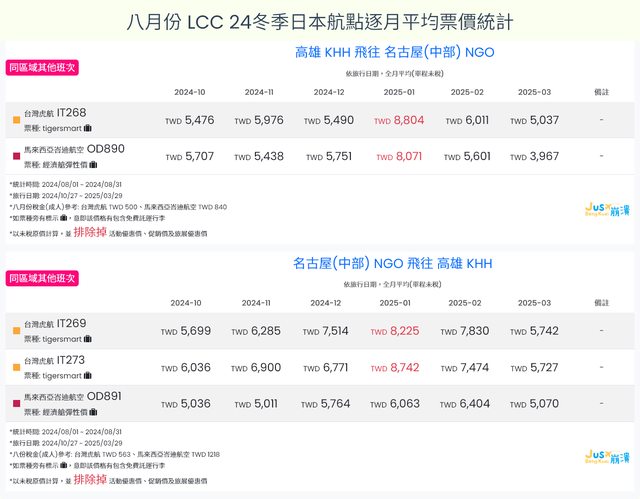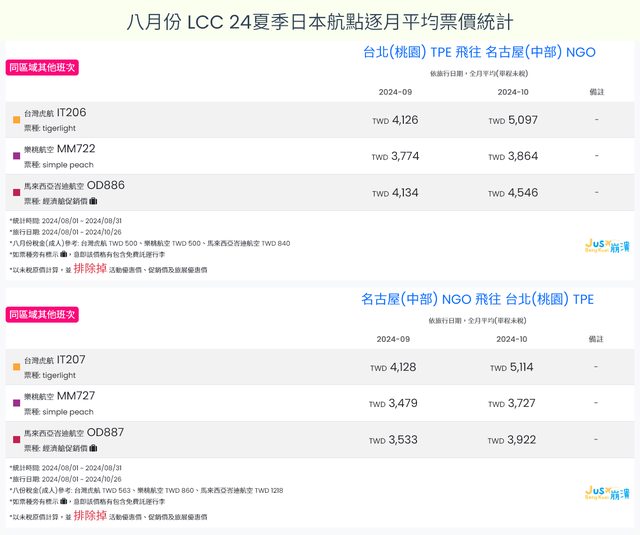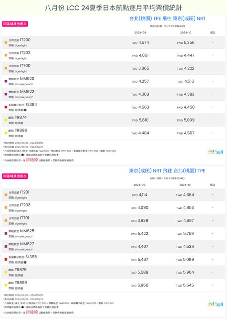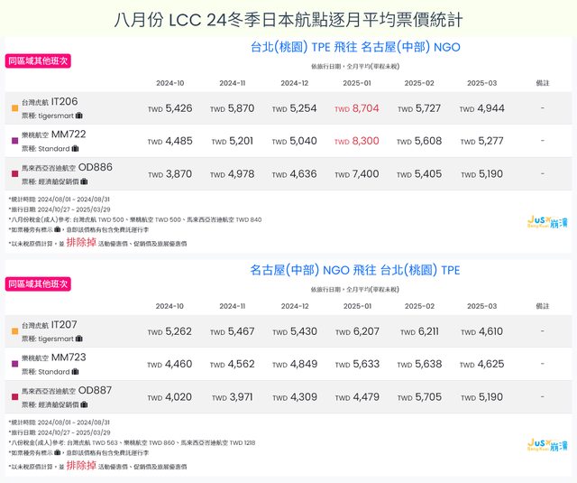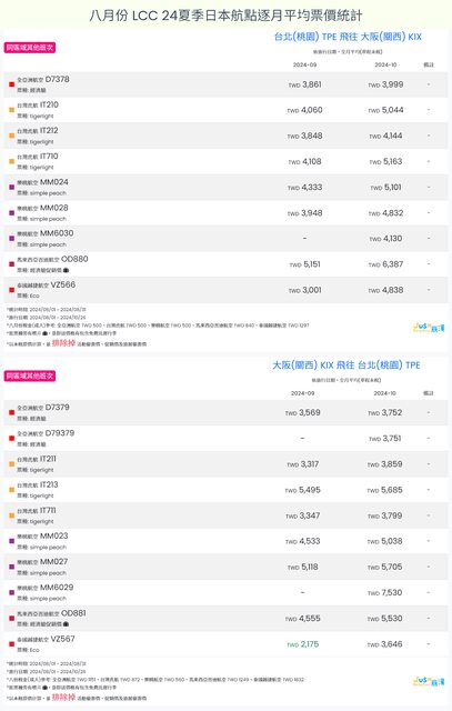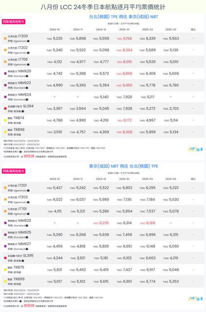 標題[分享] 8月LCC 24夏、24冬日本航點逐月均價統計