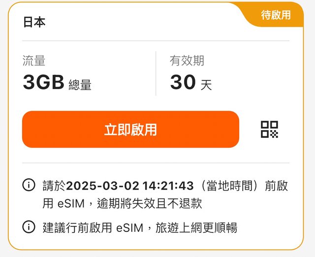 1、須於2025.3.2 14時前啟用,啟用後30日內3GB流量。