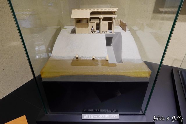 一旁還有古代水洗廁所的透視模型,裡面還真的有一位古代人正在蹲馬桶呢。XDDD