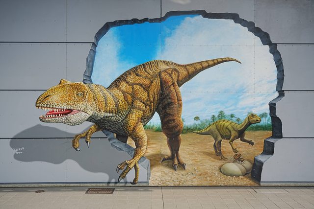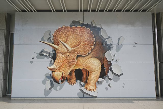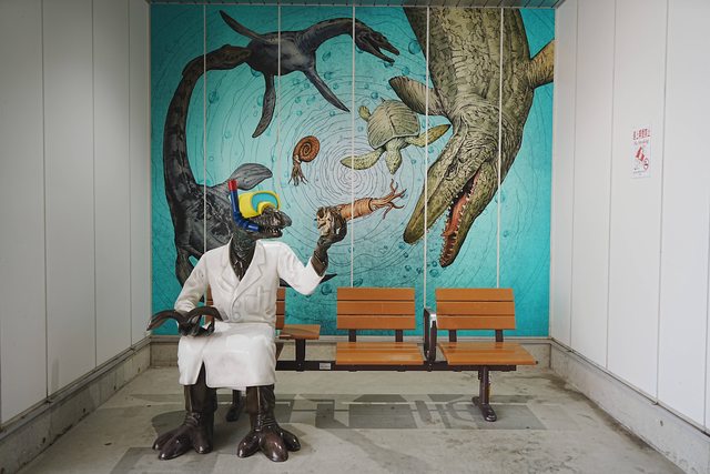 站更遠一點,車站外牆也畫滿恐龍