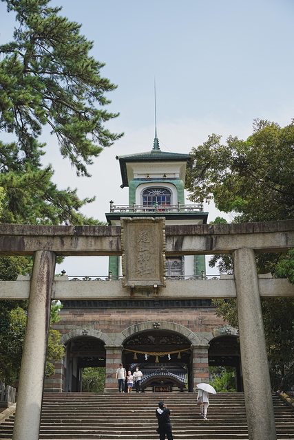 說到尾山神社有什麼特別之處的話,莫過於在正殿前方的神門,是一棟混合和洋中風格的